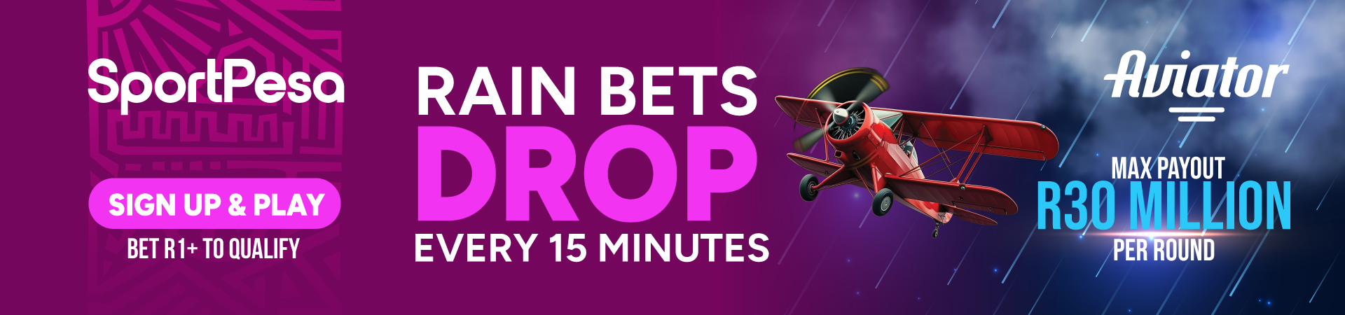 Place a R1+ bet on Aviator to unlock eligibility for Rain Bets during the promo period.Rain Bets drop in the Aviator chat every 15 minutes across four daily periods.